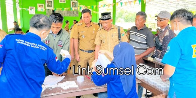 Muara Enim//Linksumsel-Sebanyak 27 Kepala Desa (Kades), 27 Ketua Badan Permusyawaratan Desa (BPD), 27 Ketua Koperasi Merah Putih, 27 Ketua Badan Usaha Milik Desa (BUMDES),dan 27 Ketua Karang Taruna diwilayah 3 (Tiga) Kecamatan, Yakni Kecamatan Lembak, Kelekar, dan Belida Darat Kabupaten Muara Enim dilakukan Tes Urine oleh Tim Badan Narkotika Nasional (BNN) Kabupaten Muara Enim yang dilaksanakan di aula kantor Camat Kecamatan Lembak Kabupaten Muara Enim, Senin (22/12/2025).