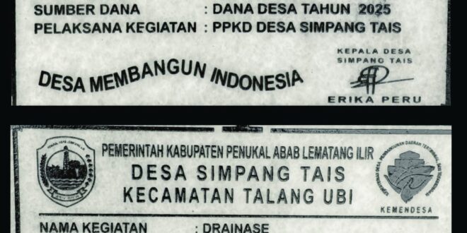 Dugaan tersebut mengemuka setelah Tim Media menemukan kejanggalan pada papan prasasti kegiatan pembangunan drainase yang akan terpasang di sejumlah titik Desa Simpang Tais.