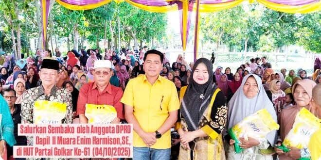Muara Enim//Linksumsel-Anggota DPRD Dapil II Kabupaten Muara Enim Harmison, SE, memanfaatkan hari jadi Partai Golkar yang ke -61 tersebut, lebih memilih merayakannya melalui bertemu langsung dengan masyarakat yakni dengan membagikan sembako kepada warga yang membutuhkan.