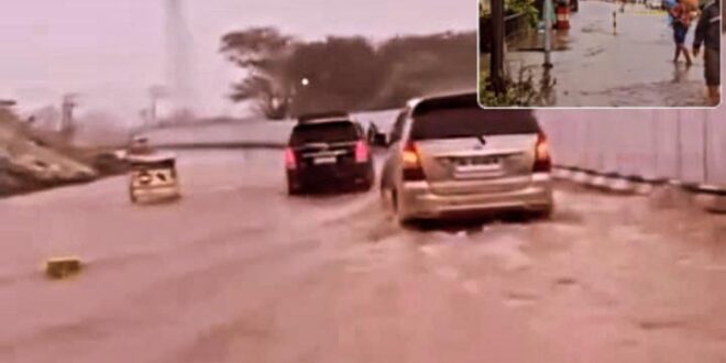 Air meluap hingga menutupi ruas jalan hingga sampai menuju persimpangan pintu rel kereta api.