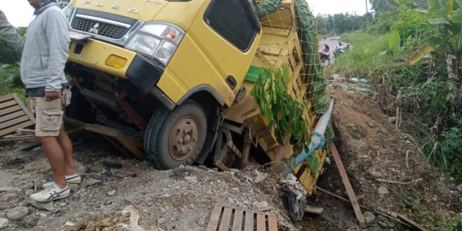 Diduga Lolos Dari Penjaga, Mobil Truk Muatan Sawit Roboh di Proyek Box Calvert Desa Embacang Kelekar Muara Enim