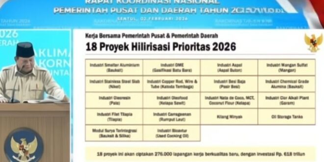 Dalam Rapat Koordinasi Nasional Pemerintah Pusat dan Daerah Tahun 2026 di Sentul, Jawa Barat, Presiden Prabowo Subiyanto menegaskan komitmen mendorong hilirisasi industri yang diprediksi menciptakan 276.000 lapangan kerja baru dengan nilai investasi mencapai Rp 618 triliun. 18 proyek dalam daftar prioritas tahun 2026 tersebut dinilai relevan dengan karakter dan potensi PALI.