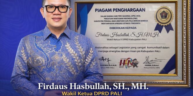 PALI//Linksumsel-Wakil Ketua DPRD Kabupaten Penukal Abab Lematang Ilir (PALI), Firdaus Hasbullah, SH. MH., menerima penghargaan Legislator Terkomunikatif dari organisasi Persatuan Wartawan Indonesia (PWI) Kabupaten PALI dalam rangka peringatan Hari Pers Nasional (HPN) 2026, yang digelar pada Senin, 9 Februari 2026.