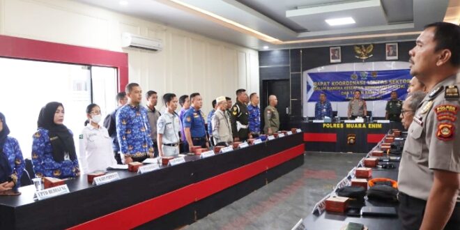 Rapat koordinasi dipimpin langsung oleh Kapolres Muara Enim, AKBP Jhoni Eka Putra, SH, SIK, MSI dan dihadiri unsur TNI, pemerintah daerah, BPBD, BUMN, BUMS, tokoh agama, serta pejabat utama Polres Muara Enim.
