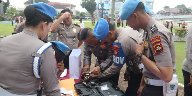 Usai apel pagi, Irwasda Polda Sumsel Kombes Pol Feri Handoko Soenarso memimpin langsung pelaksanaan pemeriksaan senjata api beserta kelengkapannya.