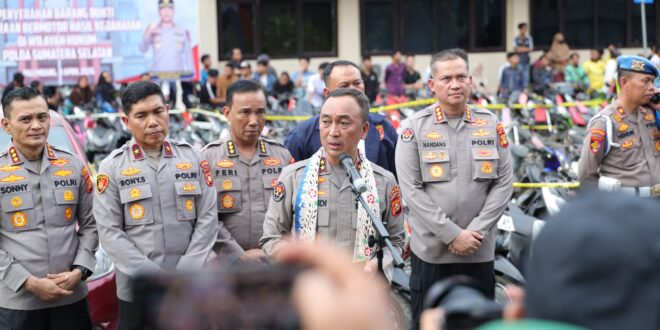 Kapolda Sumsel Sandi Nugroho memimpin langsung kegiatan penyerahan 497 unit kendaraan bermotor pada Rabu (8/4/2026) pukul 14.00 WIB di Lapangan Parkir Gedung Presisi Polda Sumsel, Palembang.