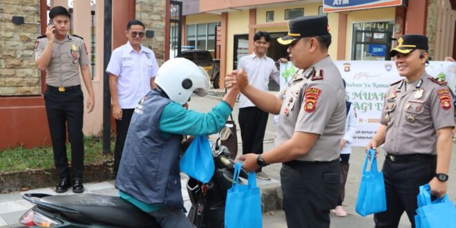 Muara Enim//Linksumsel-Suasana sore di Jalan Bambang Utoyo, tepatnya di depan Mako Polres Muara Enim, mendadak berbeda. Di tengah hiruk-pikuk kendaraan yang melintas menjelang waktu berbuka puasa, tampak sosok Kapolres Muara Enim turun langsung ke tepi jalan membagikan takjil kepada para pengguna jalan.