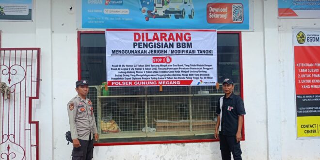 Muara Enim//Linksumsel-Dalam upaya menjaga ketertiban dan mencegah penyalahgunaan bahan bakar minyak (BBM), Polsek Gunung Megang melaksanakan pemasangan spanduk himbauan kepada masyarakat agar tidak melakukan pengisian BBM menggunakan jerigen maupun tangki modifikasi, Senin (16/3/2026).