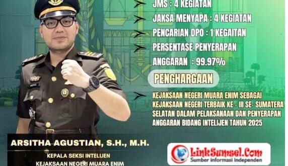 Muara Enim//Linksumsel-Kejaksaan Negeri (Kejari) Muara Enim melalui Kepala Seksi Bidang Intelijen Kejaksaan Negeri (Kejari) Muara Enim Arsitha Agustian SH,MH, merilis dalam capaian kinerja Bidang Intelejen Tahun 2025 dalam upaya menciptakan penegakan hukum serta mendukung dalam menyelamatkan kerugian keuangan negara demi terciptanya kesejahteraan masyarakat.