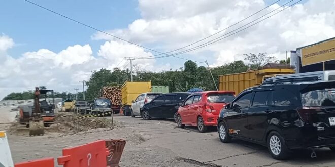 Muara Enim//Linksumsel-Terdapat sebuah mobil truk bermuatan kayu karet gelondongan mengalami patah As dijalan alternatif proyek Fly Over Gelumbang hingga menyebabkan terjadinya kemacetan kendaraan yang cukup panjang, pada Sabtu (20/12/2025) siang.